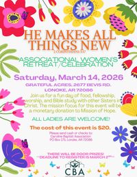 We are excited to be hosting the women’s retreat/celebration on Saturday, March 14, at Grateful Acres in Lonoke. Registration begins at 8:30 that morning, with the retreat wrapping up that afternoon. The theme is “He Makes All Things New,” with 2 Corinthians 5:17 being the theme verse. The cost is $20/person which covers part of the meals and the venue. A breakfast and lunch will also be served. There will be a Bible study entitled “The Way Home,” by Tessa Afshar, which will include table discussions. There will also be praise and worship and a time for the yearly Women’s Celebration.